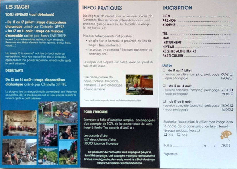 - du 13 au 17 juillet : stage accordéon diatonique tous niveaux (sauf débutants), animé par Christelle SIFFRE